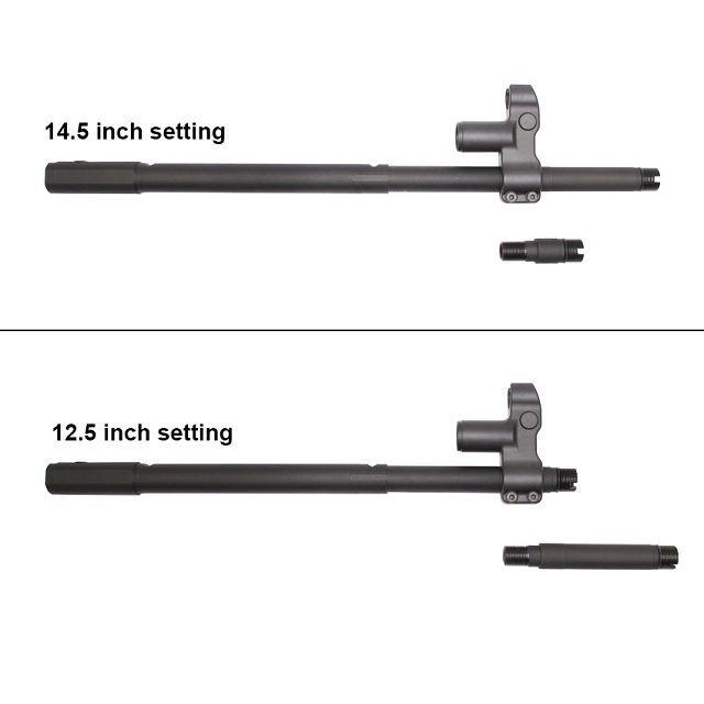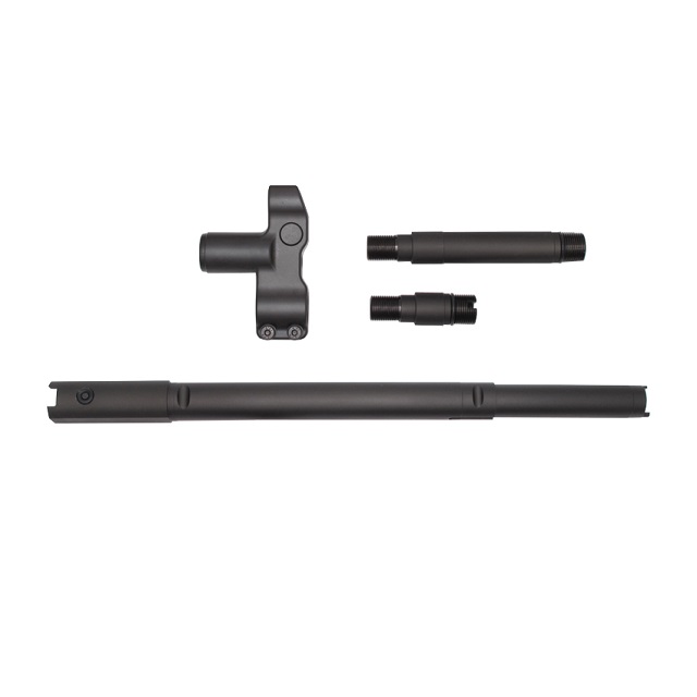 The steel front sight/gas block and 6061 aluminium outer barrel set are made by precision CNC machines. It fits AKM (T.Marui GBB) only. The steel front sight post is 'up & down' adjustable. The outer barrel set has matt hardcoat-anodized finishing, and includes a long forward part outer barrel (for 14.5" barrel) and a short forward part outer barrel (for 12.5" barrel). Forward end of outer barrels have 14mm CCW (anti-clockwise) thread for flash hider. This front sight/gas block must be installed on this outer barrel set, and their construction ensure correct up-right position/alignment with the original Marui AKM receiver, hop-up system and aft-sight. Please see photos of installation procedure.