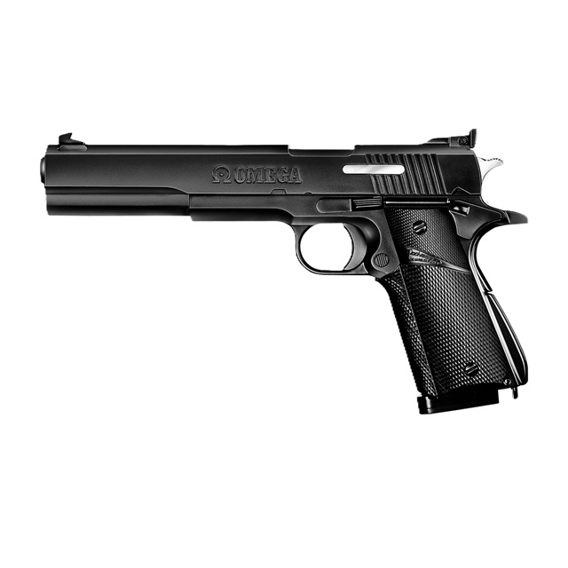 スプリングフィールド・アーモリー社の「オメガ」は、射撃のウデを競うシューティング競技用としてガバメントをベースにカスタムしたハンドガンです。スライドとバレルの上面には発射時にマズルがはね上がるのをおさえるためのポート(穴)を空けるなど、シューティングモデルに欠かせない工夫がこらしてあります。