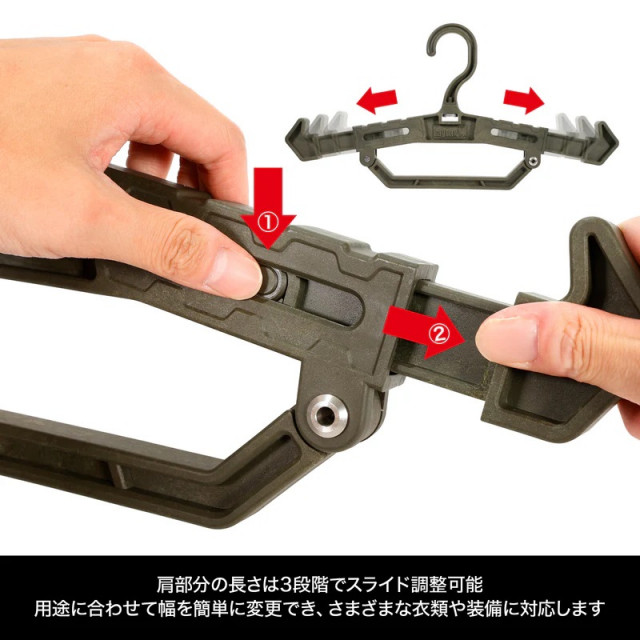 ●ハンガー肩幅を3段階で調整できる可変ギミック搭載!アームの向きも上下で変更でき、吊るす物や用途に合わせた使い方が可能