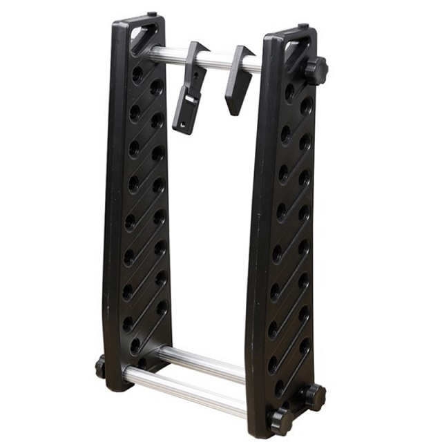 付属の仕切りホルダーをネジで締め込み、ライフルのサイズによって左右自由にホルダーを調整することができ、樹脂製支柱には上部に穴があり、重りとして水や砂などを入れて、しっかりとスタンドさせることができます。