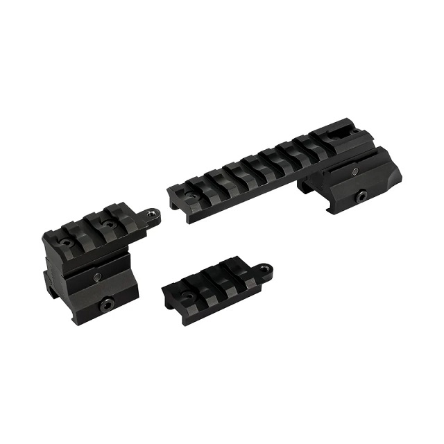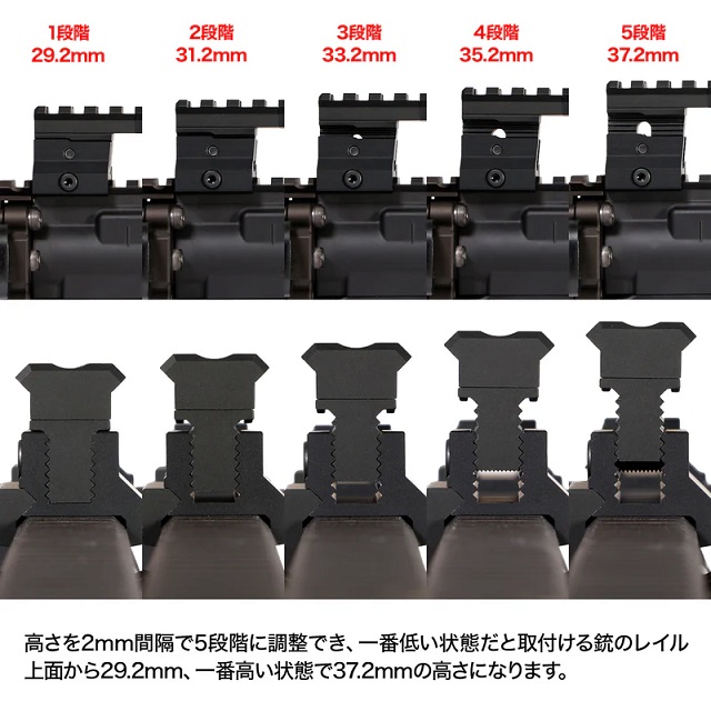 ピカティニーレイルを搭載した銃に取付け可能なキャリングハンドル風ハイマウントレイルです。高さを2mm間隔で5段階に調整でき、一番低い状態だと取付ける銃のレイル上面から29.2mm、一番高い状態で37.2mmの高さになります。さらにレイル部は大、中、小の3パーツで構成しており、中レイルを取外し全長を短くしたり、小レイルとクランプパーツを取外し片持ち状態で使用したりとプレイバリューの高い製品になっています。外観はM4系のキャリングハンドルを近代化したイメージでデザインしており、中レイルを抜いた状態でM4系の銃に取付けるとアッパーレシーバー上に綺麗に収まります。また、後部はチャージングハンドルの操作を邪魔しないようえぐられており、実用性にも考慮しています。