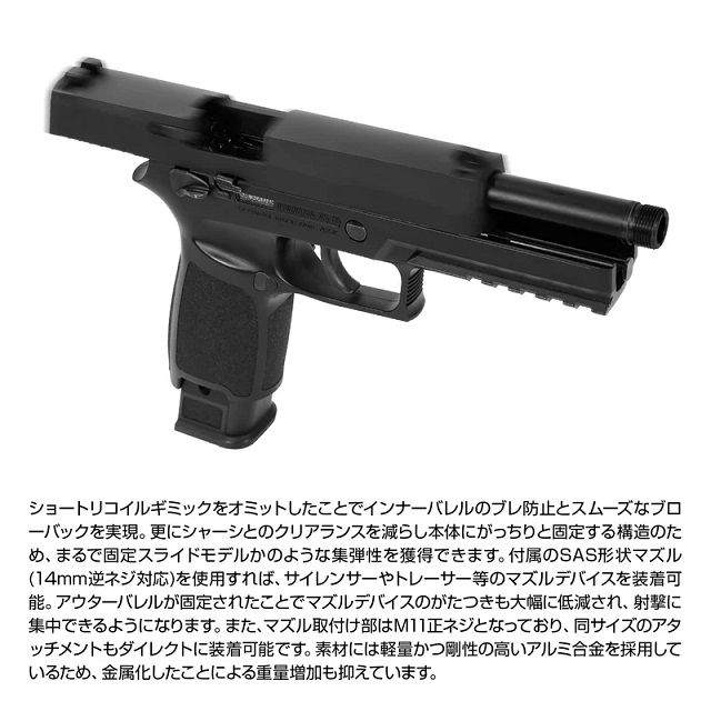 東京マルイ P320フルサイズ用のメタルアウターバレルです。ショートリコイルギミックをオミットしたことでインナーバレルのブレ防止とスムーズなブローバックを実現。更にシャーシとのクリアランスを減らし本体にがっちりと固定(※)する構造のため、まるで固定スライドモデルかのような集弾性を獲得できます。付属のSAS形状マズル(14mm逆ネジ対応)を使用すれば、サイレンサーやトレーサー等のマズルデバイスを装着可能。アウターバレルが固定されたことでマズルデバイスのがたつきも大幅に低減され、射撃に集中できるようになります。また、マズル取付け部はM11正ネジとなっており、同サイズのアタッチメントもダイレクトに装着可能です。素材には軽量かつ剛性の高いアルミ合金を採用しているため、金属化したことによる重量増加も抑えています。