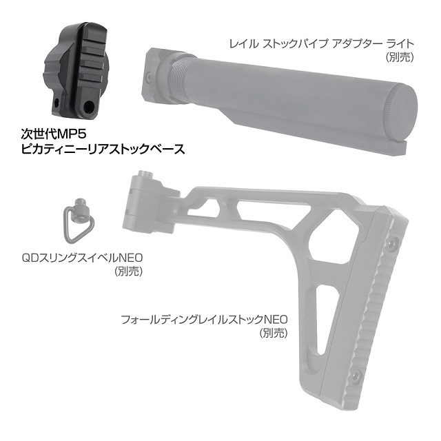 東京マルイ 次世代MP5のピカティニーレイルを配したストックベースです。当製品を取付けることで当社製『レイルストックパイプアダプターライト』や『フォールディングレイルストック』を装着可能になります。ピカティニーレイル上の任意の位置にストックポジションの調整が可能で、お好みのスタイルへとカスタマイズできます。また、QDスリングスイベル用のホールも装備しており、自由度の高いスリングワークを実現します。