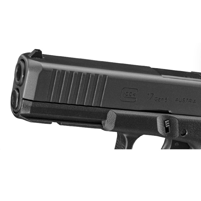 スライドフロント部の変更点(面取りやセレーションの追加)や、フィンガーチャンネルのないグリップ、アンビ仕様になったスライドストップなど、G17第5世代(Gen5)の特徴を再現しています。