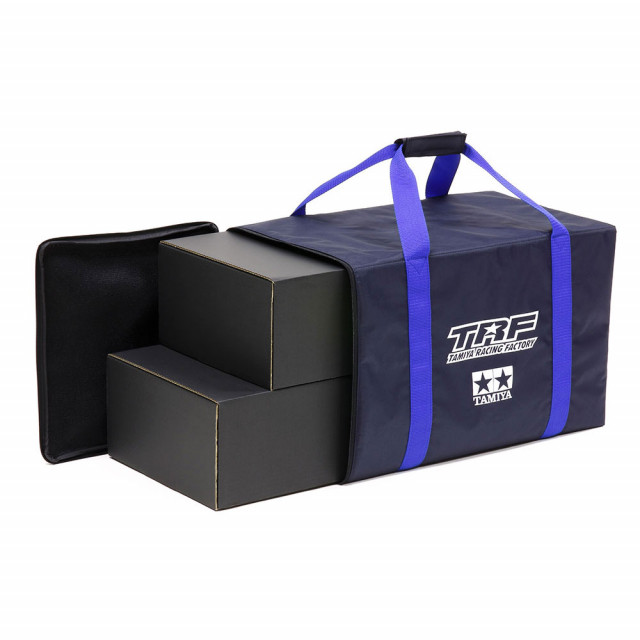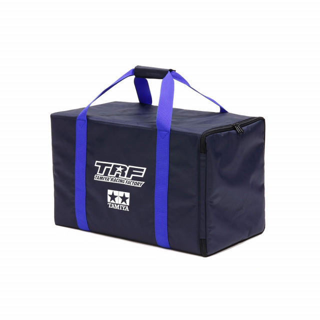 シックなネイビーブルーにホワイトのTRFロゴ、そしてライトブルーのベルトが鮮やかなRCバッグです。1/10ツーリングカーなどがぴったり入るインナーボックス2個付き。マシンの他に工具やタイヤ、送信機などを整理して収納できます。またサイドの開口部はダブルファスナーを採用。