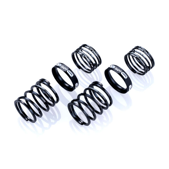 ヘルパースプリングを採用したツインタイプ。メインを自由長20mmとし、ヘルパースプリングにも角断面形状の材料を採用。スプリングシートにも軽量化を施すことでスプリング全体の追従性を向上、特にリヤに使用した際のトラクション性能が向上します。さらにヘルパースプリングが線間密着した時のみに現れるODロゴも拘りの一つです。