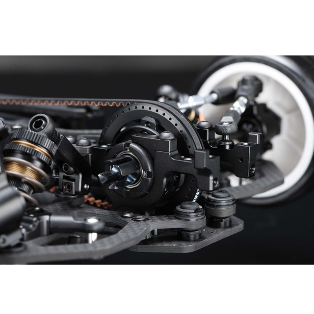 アルミ製のナックルを標準装備し、高精度なライントレースとレスポンスを確保しています。アルミの部分は前後共通で、グラファイト製のアーム部分のみ前後で形状が違います。