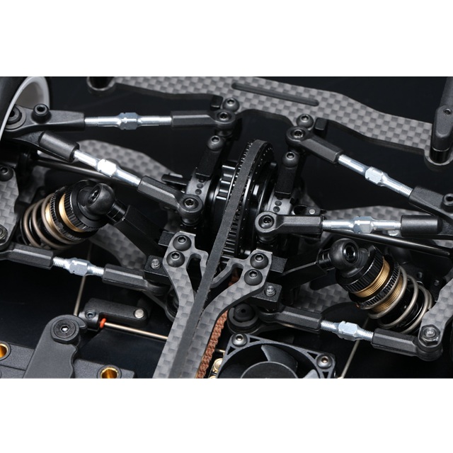 従来よりも薄型の1.5mm厚アルミ製メインシャーシは低重心化を果たしハイサイドを防止、それでいて適度なフレックスはドライバーへの負担を軽減し、緊張感の高まるタイムアタックでも余裕をもたらします。従来から薄型のシャーシでは裏面からのネジ止めがネックとなっていましたが、MS2.0では専用の高精度スクリューを使用し、正確なマシンビルドが可能です。