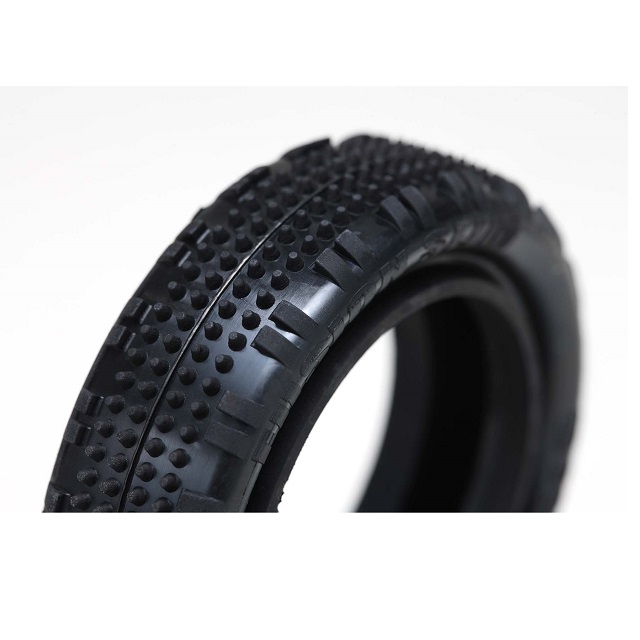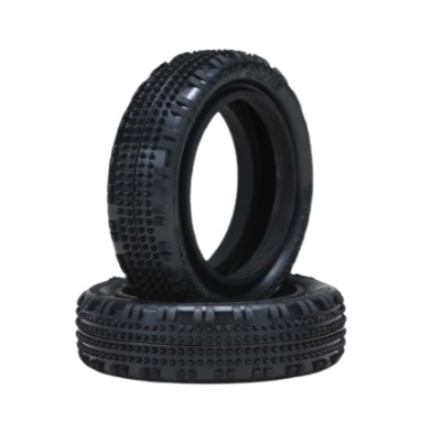 これまで 4WD 用のフロントタイヤとして定番だったフュージョンのデザインをスリム化し、特にカーペットや人工芝などのハイグリップ路面に適した特性となります。ショルダーのブロックによるコーナーでの引っ掛かり感を低減しつつ、テーパーピンで安定感の高いニュートラルなステアリング特性を引き出します。