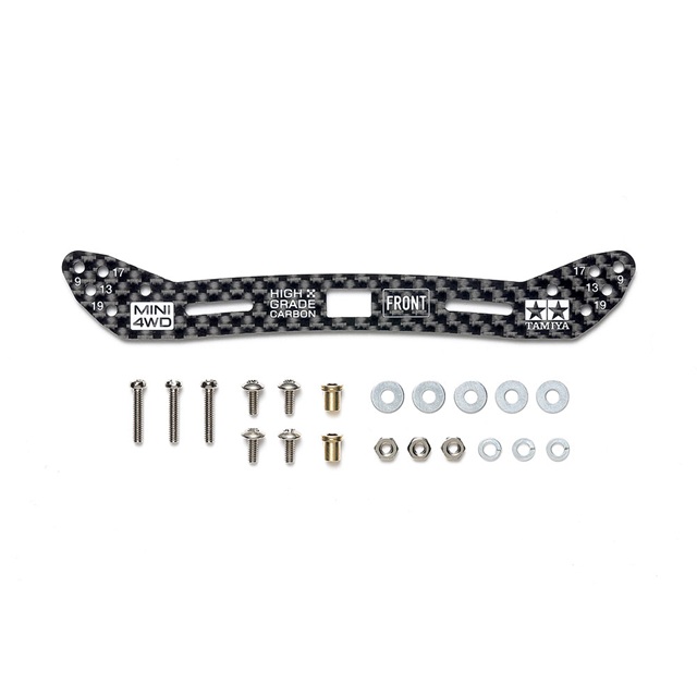 高い剛性を持つ2mm厚のカーボン製フロント用ワイドプレートです。9、13、17、19mmのローラーをレギュレーションいっぱいの幅で取り付けられる穴を開けました。さらにローラーステーとしてはもちろん、ITEM15469 フロントワイドスライドダンパーのアルミステーと置き換えての使用も可能です。レーシーな雰囲気を高めるカーボン模様に加えて、タミヤマークやミニ四駆のロゴをホワイトでプリントしました。ME、MA、MS、VZ、FM-A、AR、VS、スーパーllシャーシ各車に使えます。※本製品のみではスライドしません。※印刷が取れるため、クリーナー等は使わないでください。