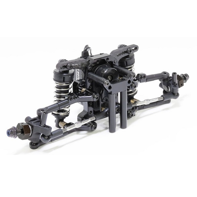サスペンション、サーボ、ステアリング 機構を統合化したユニットは、4本のネジ(フロントギアボックス固定部)のみでシャーシとの連結可能としています。