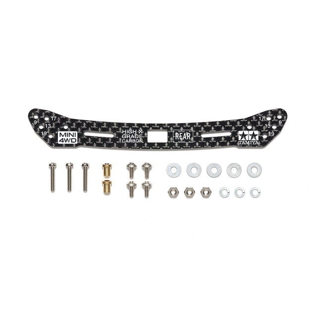 高い剛性を持つ2mm厚のカーボン製リヤ用ワイドプレートです。9、13、17、19mmのローラーをレギュレーションいっぱいの幅で取り付けられる穴を開けました。さらにローラーステーとしてはもちろん、ITEM15467 リヤワイドスライドダンパーのアルミステーと置き換えての使用も可能です。レーシーな雰囲気を高めるカーボン模様に加えて、タミヤマークやミニ四駆のロゴをホワイトでプリントしました。ME、MA、MS、VZ、AR、VS、スーパーllシャーシ各車に使えます。※本製品のみではスライドしません。※印刷が取れるため、クリーナー等は使わないでください。