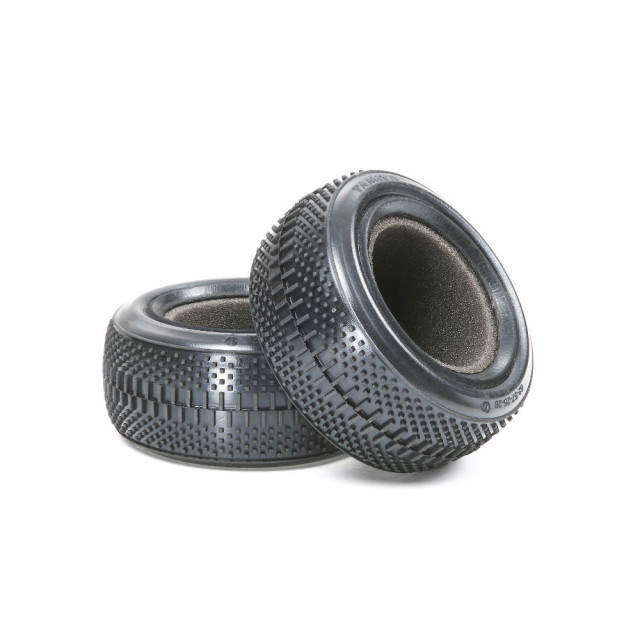 正方形と長方形の2パターンのブロックを配した4WDバギーのフロントタイヤです。ハイグリップコンパウンドの使用により、硬く締まったオフロード路面で優れたグリップを発揮します。