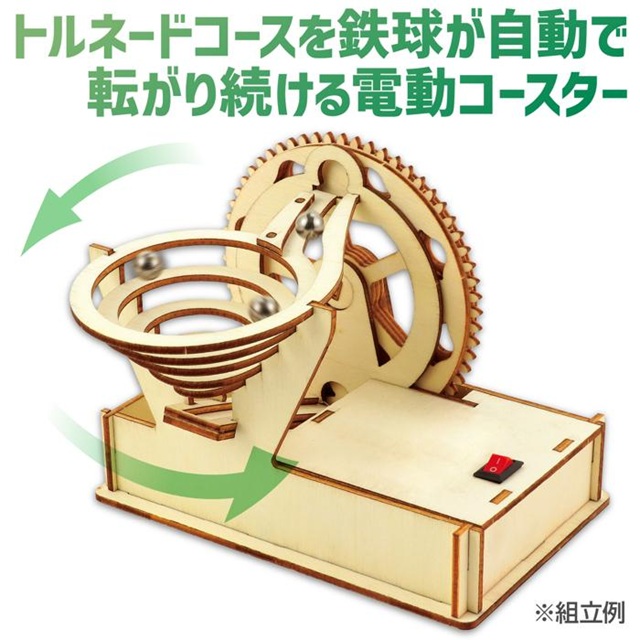 自動で動く木製コースター工作キットです。スイッチを入れると歯車が作動し、鉄球がらせん状のコースを繰り返し走ります。自由研究などにもぴったりな知育・体験型の工作キットです。