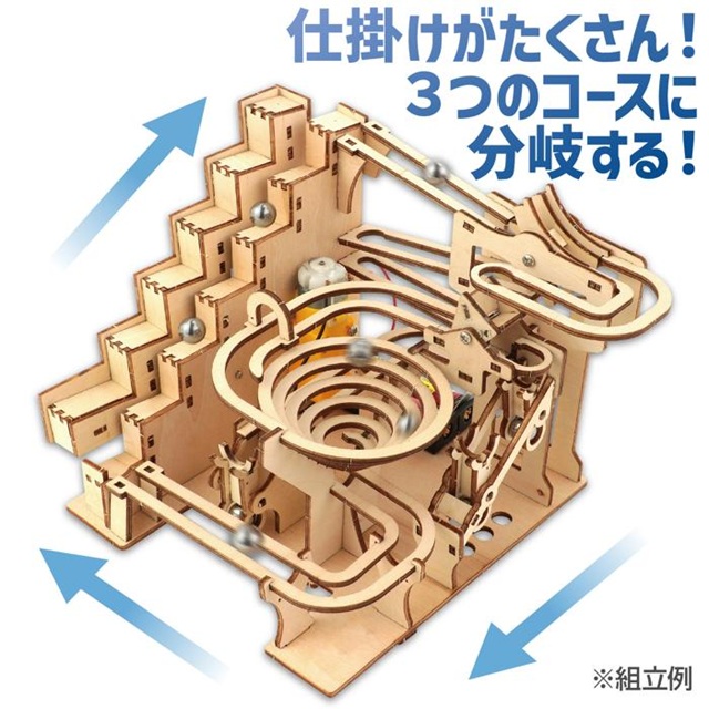 自動で動く木製コースター工作キットです。スイッチを入れるとボールがエレベーターで持ち上がり複数のコースをぐるぐる回ります。完成後は見ているだけでも楽しい動くインテリアにもなる工作キットです。
