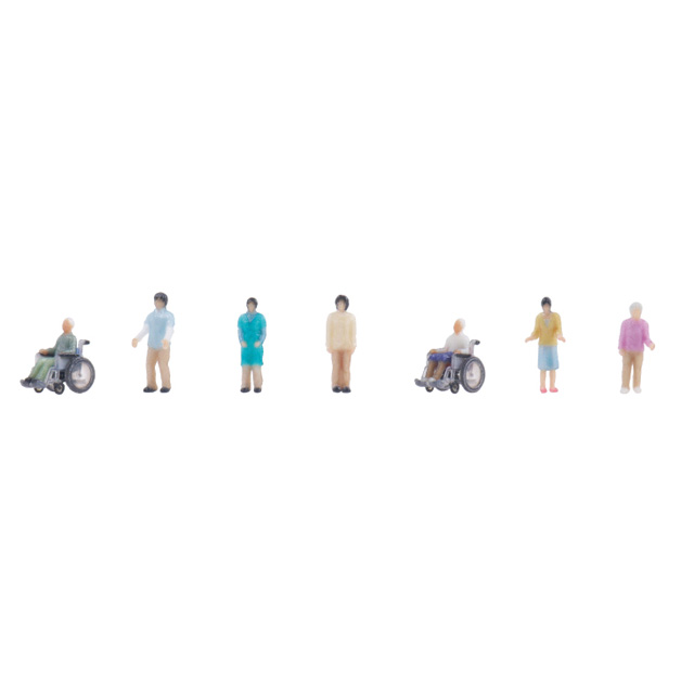 ・リアルに再現された車椅子と高齢者、それに同伴のデイサービススタッフあるいはご家族による構成で日常のシーンを再現