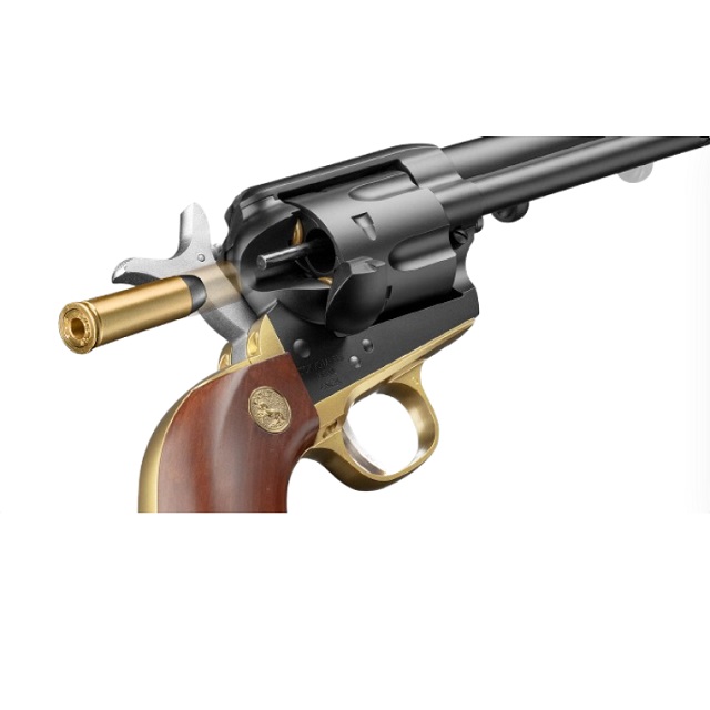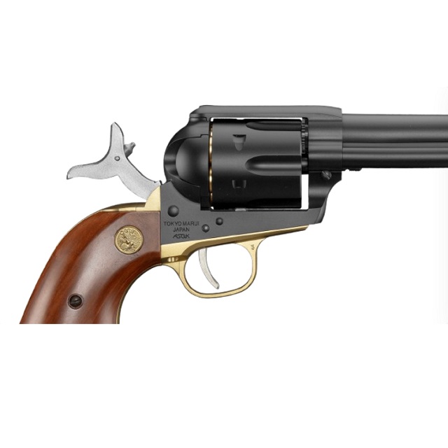 「キャバルリー」と呼ばれるバレル長7.5インチのSAA.45をベースに、真鍮色のトリガーガードとグリップフレーム、そして木目塗装のメダリオン付きウッドタイプグリップを採用したカスタムモデルです。ハンマーにはシルバーの塗装を施しました。