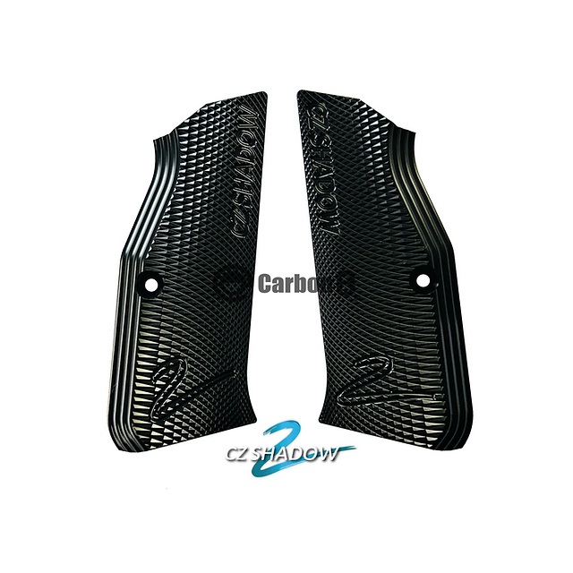 CNC切削&アルマイト処理がされたカスタムグリップパネル。グリップパネルには、CZ社公式ロゴとSHADOW-2のリアルな彫刻が施されています。