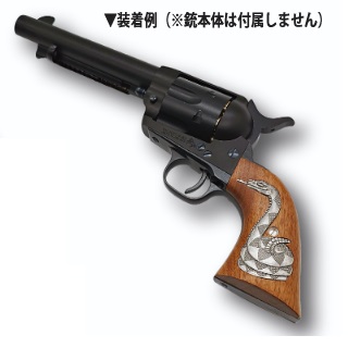 複数の映像資料をもとに全体像を読み取り、細部のディティールに至るまで忠実に再現した、自信作です。木材には、厳選された最高級のブラック・ウォールナットを使用。裏面にはステンレス製の重りを内蔵し、剛性を高めています。ウォールナットの温もりと、SAAが持つ無骨な鉄の重さとが調和した、手応えのある仕上がりです。細部まで考証を重ね、最高の素材と技術で仕上げたこのラトルスネーク・グリップは、“世界一の再現度” を目指して製作された決定版です。目の肥えたファンの方はもちろん、そうでない方も、今一度この素晴らしい作品を見直していただき、拘りの詰まったこのラトルスネーク・グリップと共に、ドル 3 部作の魅力にどっぷり浸ってみてはいかがでしょうか。