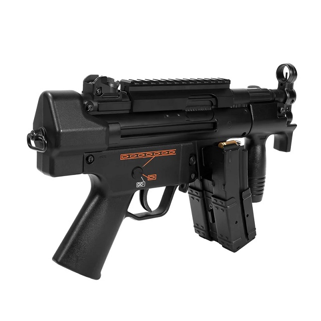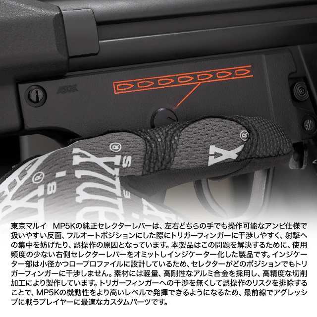 東京マルイ MP5Kの純正セレクターレバーは、左右どちらの手でも操作可能なアンビ仕様で扱いやすい反面、フルオートポジションにした際にトリガーフィンガーに干渉しやすく、射撃への集中を妨げたり、誤操作の原因となっています。本製品はこの問題を解決するために、使用頻度の少ない右側セレクターレバーをオミットしインジケーター化した製品です。インジケーター部は小径かつロープロファイルに設計しているため、セレクターがどのポジションでもトリガーフィンガーに干渉しません。素材には軽量、高剛性なアルミ合金を採用し、高精度な切削加工により製作しています。トリガーフィンガーへの干渉を無くして誤操作のリスクを排除することで、MP5Kの機動性をより高いレベルで発揮できるようになるため、最前線でアグレッシブに戦うプレイヤーに最適なカスタムパーツです。