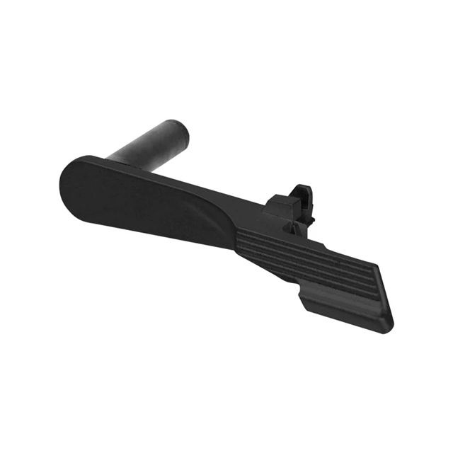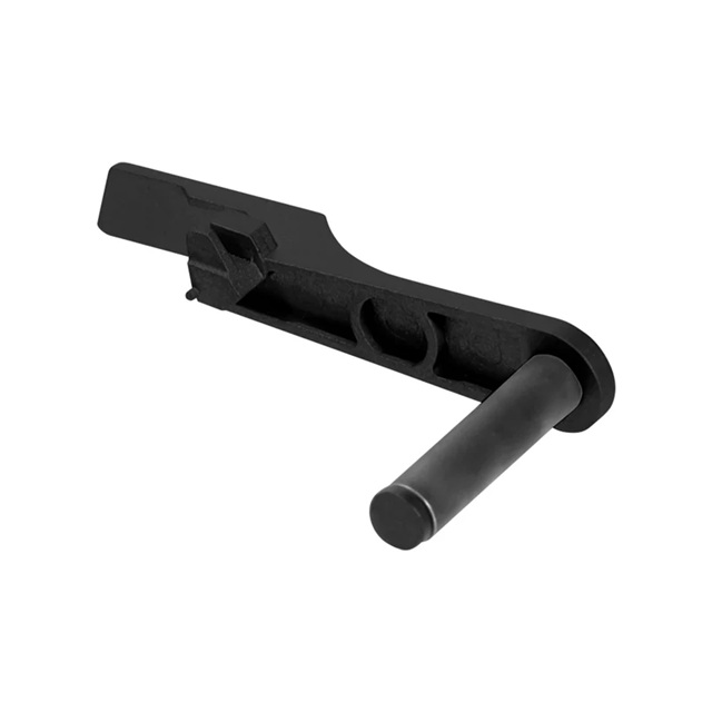 ハイキャパ5.1や4.3、各種ガバメント系の純正スライドストップは小型のため、片手での素早い操作には向いていません。そのためゴールドマッチ等のカスタムモデルにはスライドストップ後端を延長し大型化したカスタムスライドストップが搭載されていますが、操作しようとするとセーフティーレバーに指が干渉しやすいという弱点があります。当製品はスライドストップ後端の延長に加えて操作部を下方向に延長したことで、セーフティーレバーとの干渉を回避しています。操作部はロープロファイルながらも押し下げやすいL字形状になっており、上からではなく側面から操作できるため、わずかな指の動きでスピーディに操作可能です。軸部にはフリー回転するパイプを搭載。スライドストップのスムーズな作動をサポートします。スライドのノッチに引っ掛かる部分はゴールドマッチを踏襲しており、スライドストップの補強ありなしに関わらず幅広い機種に対応します。