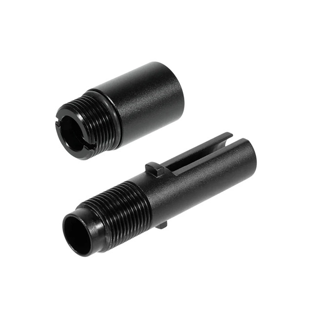 東京マルイ MP7A1 電動/ガスブローバックの両方に対応する、アウターバレルと14mm逆ねじアダプターのセットです。アウターバレル内部の段差を無くしたことで純正より長いインナーバレル ※を使用できるようになるため、カスタムの幅が広がります。さらに、付属の14mm逆ねじアダプターは純正品より全長を短く設定しているため、サイレンサー等を装着した際の本体との隙間がなくなり、より一体感のあるスタイリッシュなスタイルに仕上がります。素材には軽量で剛性の高いアルミ合金を採用し、切削加工にて高精度に製作しています。