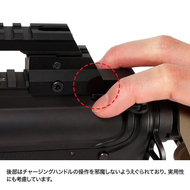 ピカティニーレイルを搭載した銃に取付け可能なキャリングハンドル風ハイマウントレイルです。高さを2mm間隔で5段階に調整でき、一番低い状態だと取付ける銃のレイル上面から29.2mm、一番高い状態で37.2mmの高さになります。さらにレイル部は大、中、小の3パーツで構成しており、中レイルを取外し全長を短くしたり、小レイルとクランプパーツを取外し片持ち状態で使用したりとプレイバリューの高い製品になっています。外観はM4系のキャリングハンドルを近代化したイメージでデザインしており、中レイルを抜いた状態でM4系の銃に取付けるとアッパーレシーバー上に綺麗に収まります。また、後部はチャージングハンドルの操作を邪魔しないようえぐられており、実用性にも考慮しています。