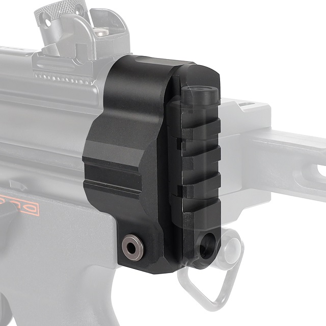 東京マルイ 次世代MP5のピカティニーレイルを配したストックベースです。当製品を取付けることで当社製『レイルストックパイプアダプターライト』や『フォールディングレイルストック』を装着可能になります。ピカティニーレイル上の任意の位置にストックポジションの調整が可能で、お好みのスタイルへとカスタマイズできます。また、QDスリングスイベル用のホールも装備しており、自由度の高いスリングワークを実現します。