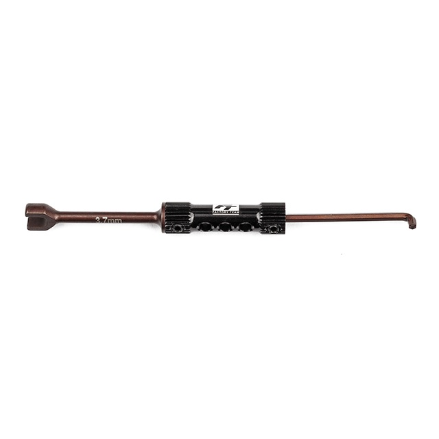 このツールひとつで、タイヤを外すことなくボールデフの調整ができ、反対側を使えば 3.7mm ターンバックル(Factory Team製など)の調整も可能です。