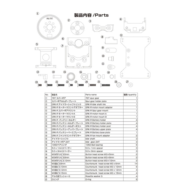 GS2EVO(MOD)やGRK4にもGRK5-Rのようなモーターレイアウトにしたいというご要望にお応えして、GRK5-Rキット用として必要であったアッパーデッキをセットから取り除き(※1)GS2EVO(MOD)やGRK4では標準装備されていないレーシングスパーギア(76T)を追加しました。