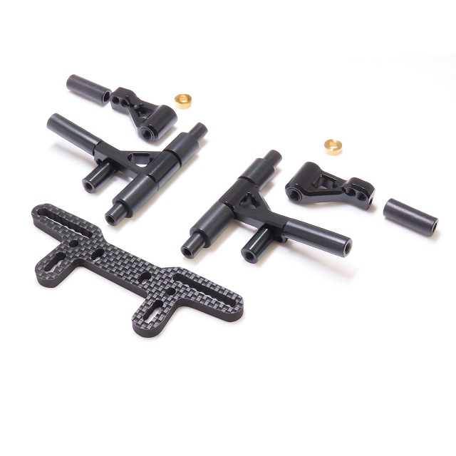 TT-02のポテンシャルを最大限に引き出す、RWDドリフト専用フロントサスペンション。 上下高精度切削アルミ製アームと4mm厚カーボンショックタワーを組み合わせることで、 優れた剛性・精度が再現性の高い走行を実現する高性能コンバージョンセットです。