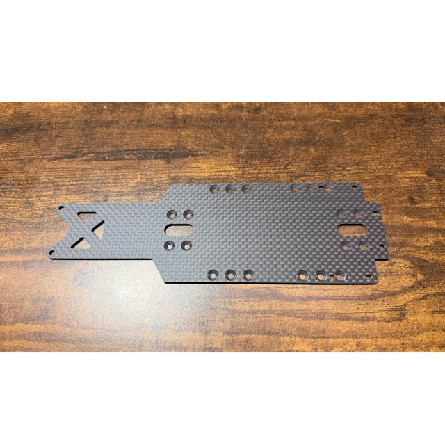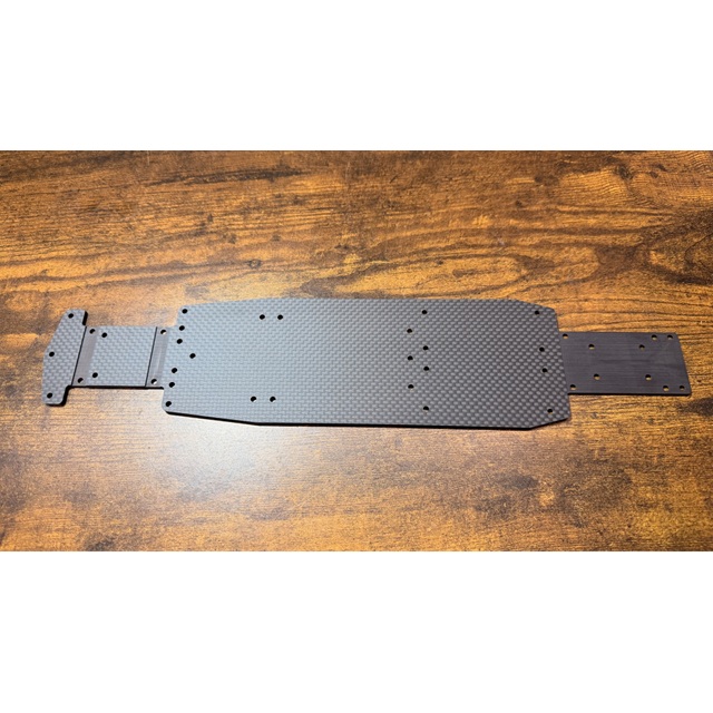 3mm厚の肉抜き無し・空力高剛性メインシャーシの前後マウント部を1mmフライス加工しジオメトリの自由度アップとドライブシャフト角を適正化出来ます。