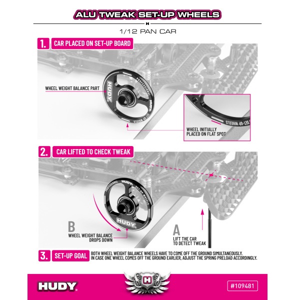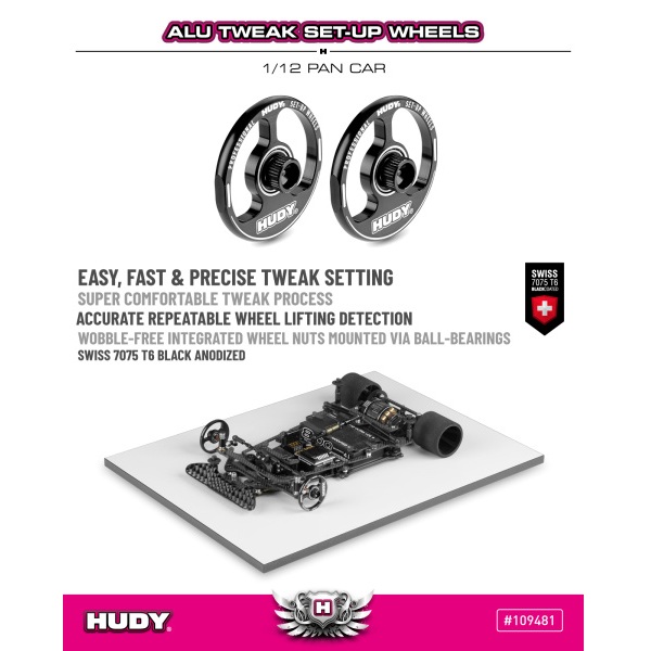 Aluminum set-up wheels designed for precise and repeatable tweak adjustment on 1/12 Pan Car chassis. The rigid aluminum construction eliminates inaccuracies caused by rubber or foam tires, allowing accurate chassis balance checks.