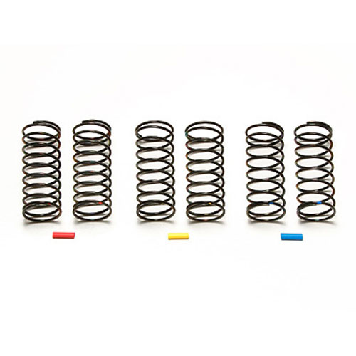 ソフト(赤印)、ミディアム(黄印)、ハード(青印)の3種を2本ずつセットしてセッティングが可能。ビッグボアARダンパーに使用する4WDバギー用のフロントスプリングセットです。識別用カラーチューブ付き。