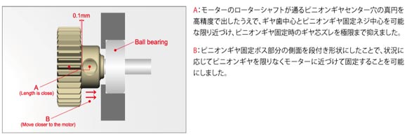 アクソンピニオンギヤはギヤ歯形状は勿論、回転時の「振れ」を左右するギヤ重量の軽量化や、穴のサイズ、真円度にもこだわり、さらにネジ位置を限りなくギヤ歯センターに近づけ、「芯ブレ」を解消しました。