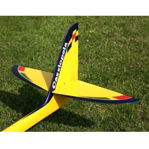 高速飛行の機体を安全に着陸させる必需品フラップ。下ヒンジで作動させ、大きな舵角を可能とし、飛行条件に応じ微妙な調整が可能。水平尾翼は旋回時に抵抗が少ないフライングテール。スロープの高速飛行から平地のサーマル飛行までカバーしてます。