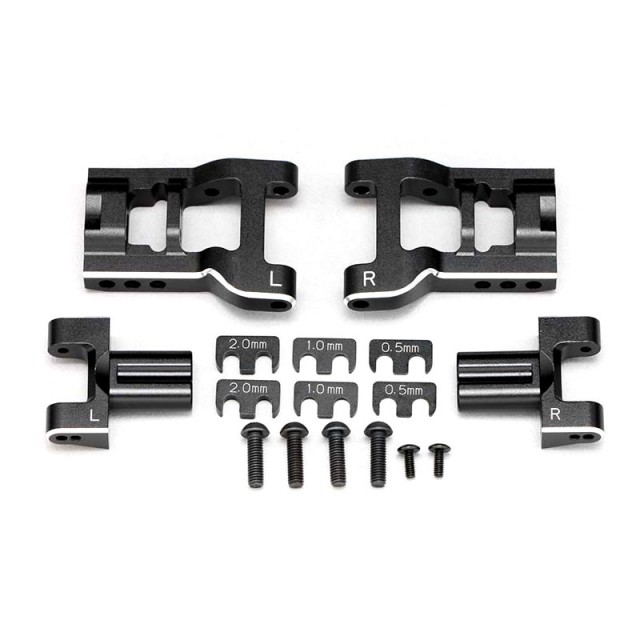 調整用のスペーサー等もセットになっていますので、ボルトオンで交換ができ、走行する路面状況に合わせた詳細なセッティングが短時間で可能です。特にコンペシーンで活躍するユーザーには必須のパーツとなります。また、Hアーム本体はベベルエッジ加工を施したアルミ製ですので、最上級の高級感 & 所有感もご堪能いただけます。
