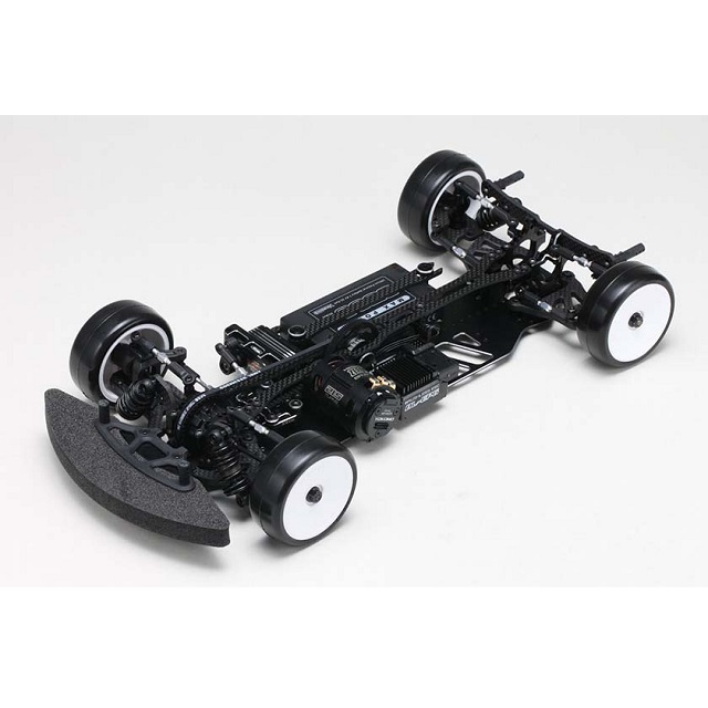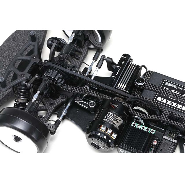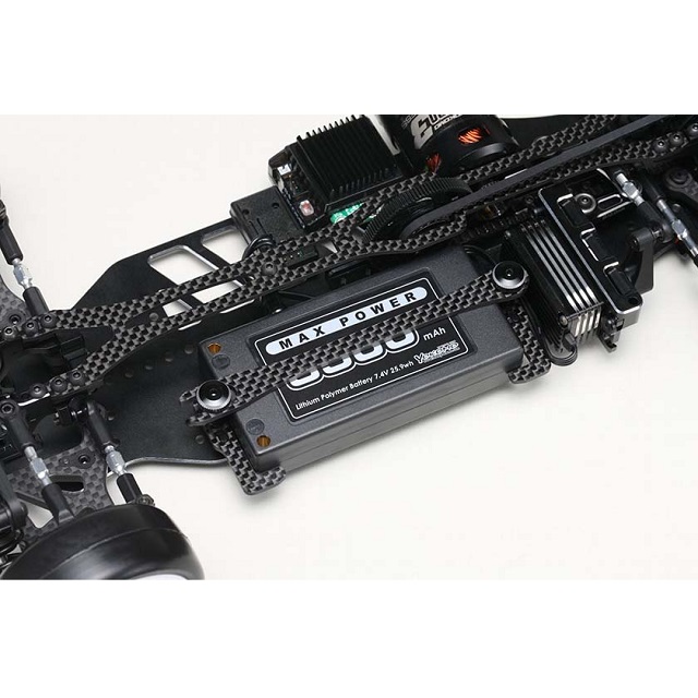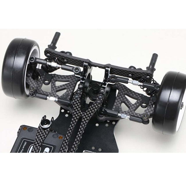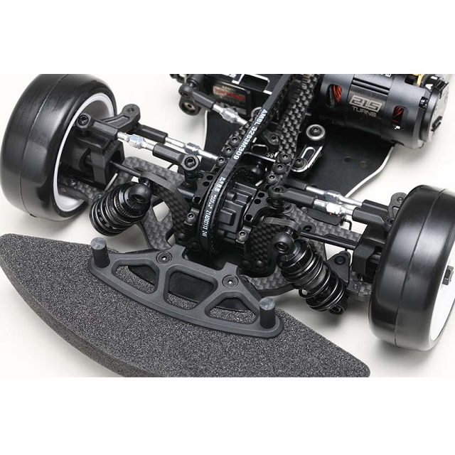 キット標準でアルミ製のメインシャーシを採用、フロント部の形状を見直し、重量のかかるフロントセクションにもかかわらず、抜群のスタビリティを発揮します。低重心ショックタワーやショートショックの採用、さらに小径スパーギヤと新型モーターマウントで徹底的な低重心化をもたらし、フロントのローマウント スタビライザーの効果と相まって、ハイスピードコーナーリングを実現します。