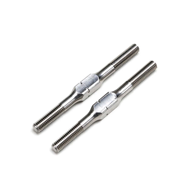 通常のキットはスチール製のターンバックルが使用されていることが多いですが、チタン製に変更することで大幅な軽量化が可能です。特にアッパーアームは装着位置も高いので、軽量化とともに低重心化にも貢献します。高精度切削で精度も高く、マシンのクオリティを高められるパーツです。長さは39mmで2本入り。
