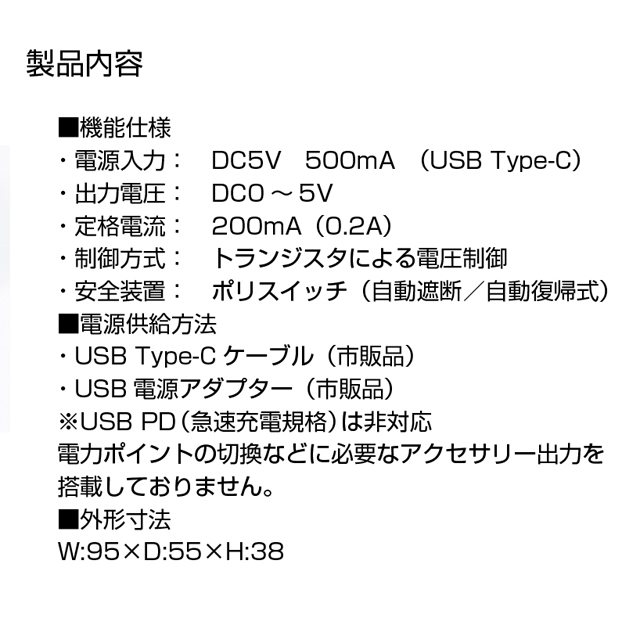 ・最大出力電圧は5V、動作保証対象車両は「新動力搭載のポケットライン」(コアレスモーター採用)製品です。コアレスモーターを搭載する小形車両の一部製品で走行可能な場合があります