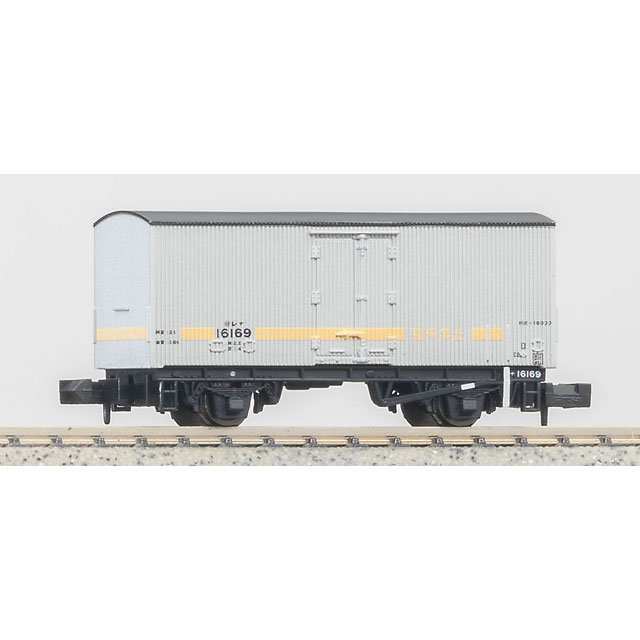 戦前製の冷蔵車レ5000を元に設計変更したレ6000の内、速度向上に対応しない車両を形式変更して区別した形式がレ16000です。冷蔵装置や氷槽を持たず、冷却源は魚箱にいれた氷に頼っています。模型は実車に則し車体を輝きの弱いくすんだ銀色で塗装します。