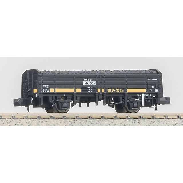 トラ23000は戦時設計貨車トラ20000から更新された二軸無蓋車で、側板の大型化により積載量が増やされています。