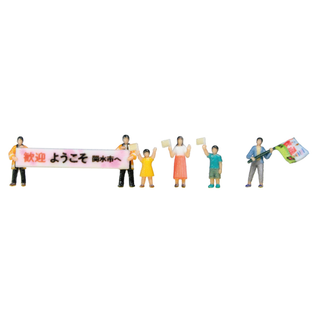 ・横断幕を持つスタッフ2人×1、小旗の児童×2(7歳女児、9歳男児)、小旗の母親×1、大旗の成人女性×1の5体/6人入