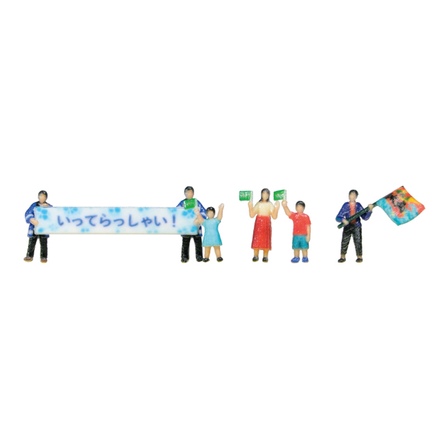 ・横断幕を持つスタッフ2人×1、小旗の児童×2(7歳女児、9歳男児)、小旗の母親×1、大旗の成人女性×1の5体/6人入