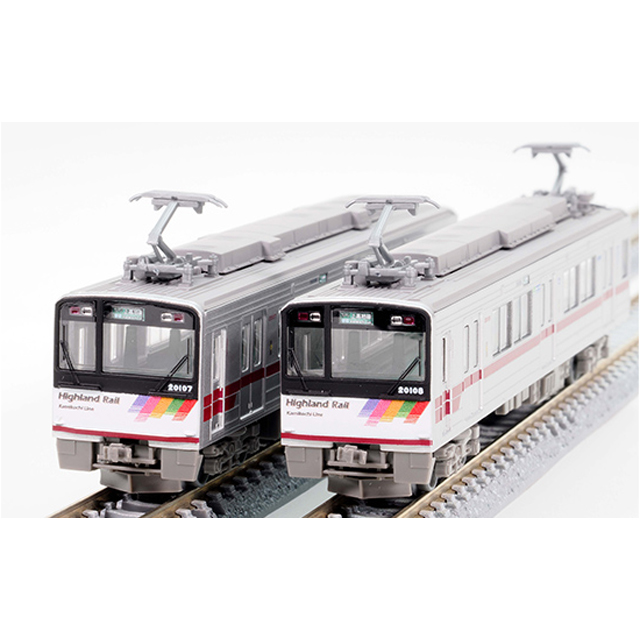 改造元となった東武鉄道20000系イメージのラインカラーを側面に配し、前面はアルピコ交通オリジナルデザインのダイナミックストライプに加えて足掛け部に側面帯と同色のラインを装飾しています。今回は20100形第4編成の「TOBU×ALPICOコラボトレイン」を製品化